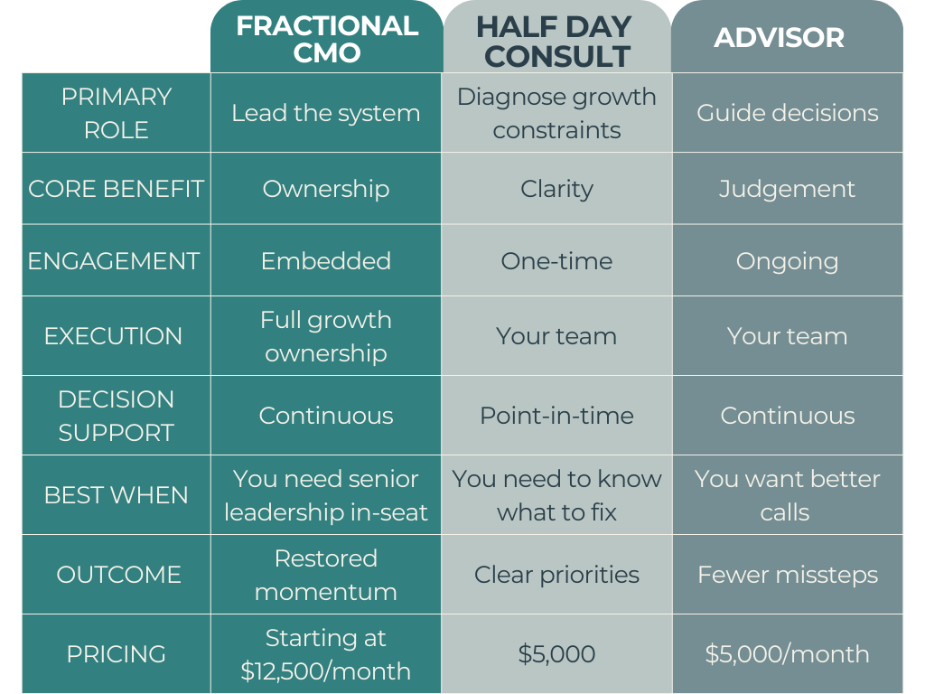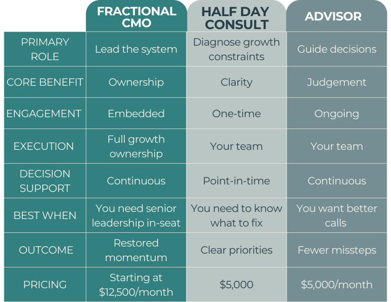 Available after at least one 90 day sprint as Fractional CMO, or a Half Day Consult