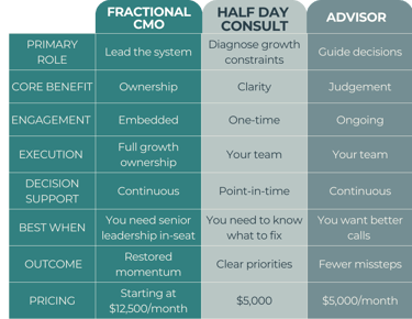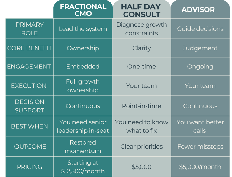 Available after at least one 90 day sprint as Fractional CMO, or a Half Day Consult